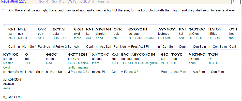 In Revelation 22 verse 5 (LEB), “And night will not exist any longer, and they will have no need for the light of a lamp or the light of the sun, because the Lord God will give light (phōtisei) to them, and they will reign (basileusousin) forever and ever (eis tous aiōnas tōn aiōnōn).”