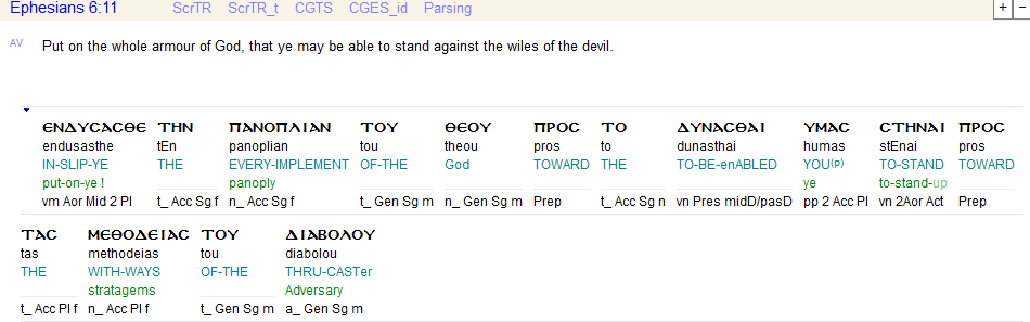 The verbs in Ephesians 6:10–18 alternate between imperatives and participles, all grounded in urgency and dependency. The imperatives (ἐνδυναμοῦσθε, ἐνδύσασθε, ἀναλάβετε, στήτε, δέξασθε) call believers to intentional, Spirit-enabled obedience. The participles reflect the condition of the prepared believer — clothed in truth, righteousness, faith, salvation, and prayer. The repeated emphasis on standing (στῆναι, στήτε, ἀντιστῆναι) clarifies that spiritual victory is not about conquest through aggression but perseverance, rooted in God’s power, resisted in faith, and sustained through prayer.
