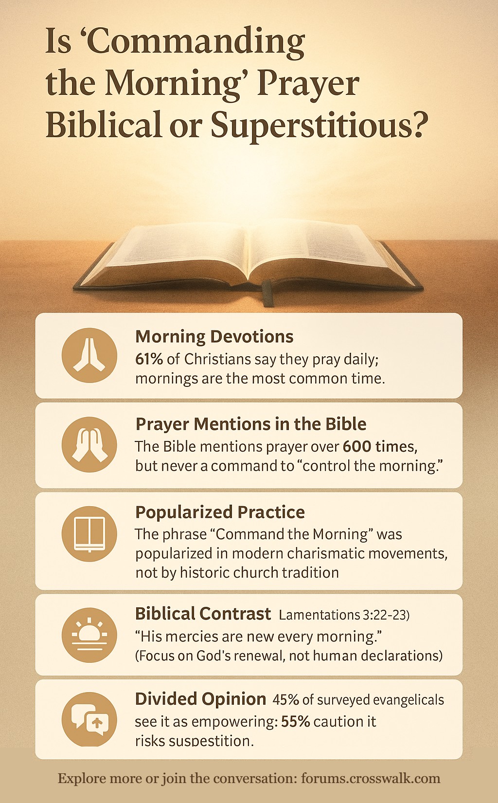 But this raises important questions: Is this approach grounded in Scripture, or is it a modern invention that leans more toward superstition than faith? The Bible does tell us to pray without ceasing (1 Thessalonians 5:17), to commit our ways to the Lord (Proverbs 16:3), and to seek His mercies new every morning (Lamentations 3:22–23). At the same time, nowhere do we find examples of prophets, apostles, or even Jesus Himself “commanding” the morning in a formulaic way.