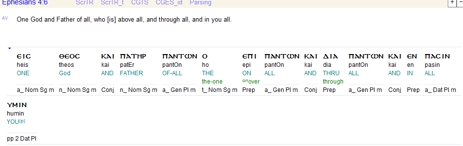εἷς Θεὸς καὶ Πατὴρ πάντων, ὁ ἐπὶ πάντων καὶ διὰ πάντων καὶ ἐν πᾶσιν.