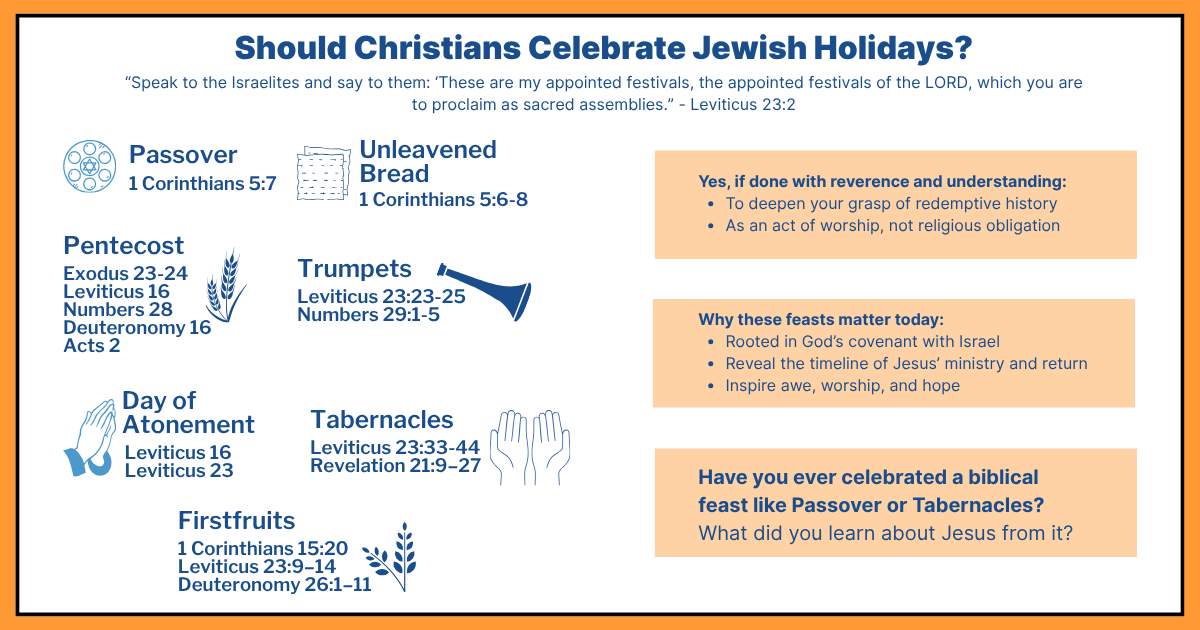 Yes, Jewish holidays, especially those laid out in the Old Testament, are rich with meaning for Christians too. These feasts aren’t just cultural traditions. They point to God’s character, His covenant faithfulness, and even the ministry and mission of Jesus (Colossians 2:16–17). After all, Jesus Himself observed them during His earthly life.